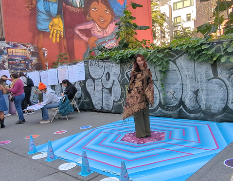 This art activation invites pedestrians to walk on the path of a labyrinth on the city sidewalk. The goal of this activity is to have a meditative and mindful experience that prompts connection. When reaching the “creativity center” of the labyrinth participants receive a handmade labyrinth souvenir. How can taking a mindful break from one’s routine awaken creativity and contemplation?